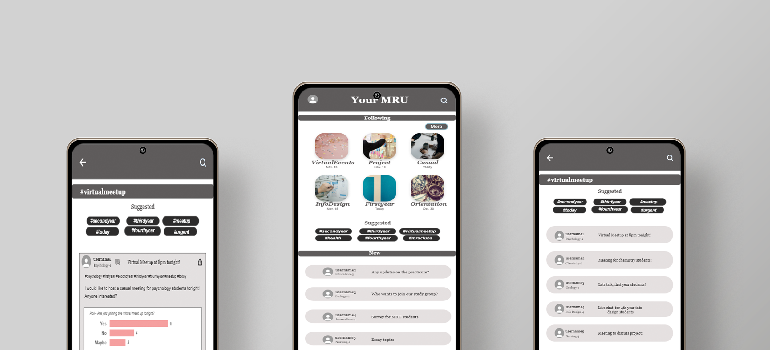 Our final high-fidelity prototype, of our mobile app appropriately addressed the needs of our user. The app, Your MRU was designed as an exclusive, informal, and multifaceted virtual platform for MRU students to socialize and build community. We designed Your MRU to be self-contained for MRU students, partially anonymous and casual, with multiple integrated social media features.